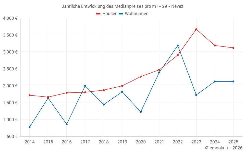 Der Durchschnittspreis auf den 34 Hausgeschäften der letzten 12 Monate in der Gemeinde Névez betrug 3 146 € pro Quadratmeter für einen mittleren Immobilienwert von 302 500 €. Über diesen Zeitraum hinweg lagen 60% der Transaktionen zwischen 2 466 und 3 934 € pro Quadratmeter (vom 2. bis zum 8. Dezil).