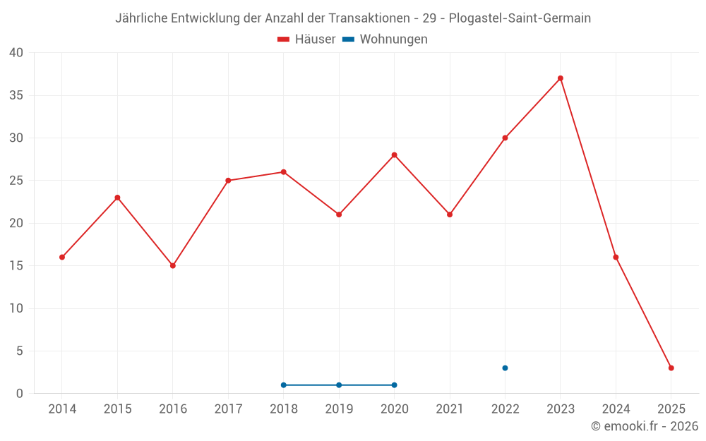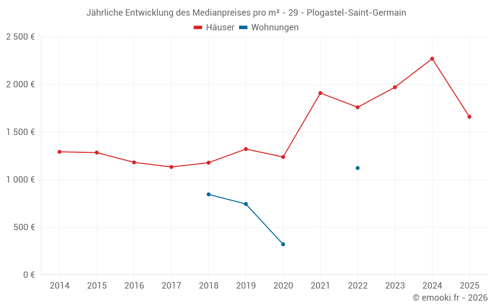 Der Durchschnittspreis auf den 39 Hausgeschäften der letzten 24 Monate in der Gemeinde Plogastel-Saint-Germain betrug 2 200 € pro Quadratmeter für einen mittleren Immobilienwert von 214 000 €. Über diesen Zeitraum hinweg lagen 60% der Transaktionen zwischen 1 589 und 2 905 € pro Quadratmeter (vom 2. bis zum 8. Dezil).