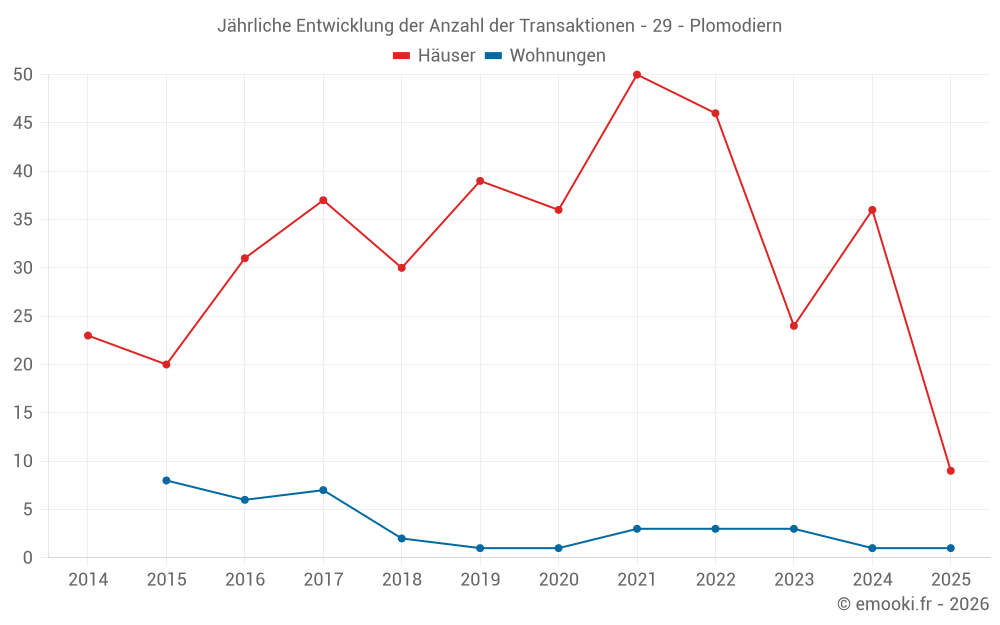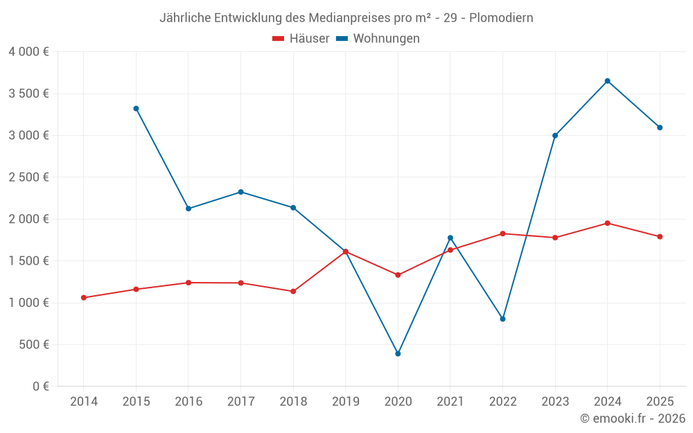 Der Durchschnittspreis auf den 28 Hausgeschäften der letzten 12 Monate in der Gemeinde Plomodiern betrug 1 768 € pro Quadratmeter für einen mittleren Immobilienwert von 198 500 €. Über diesen Zeitraum hinweg lagen 60% der Transaktionen zwischen 1 394 und 2 344 € pro Quadratmeter (vom 2. bis zum 8. Dezil).