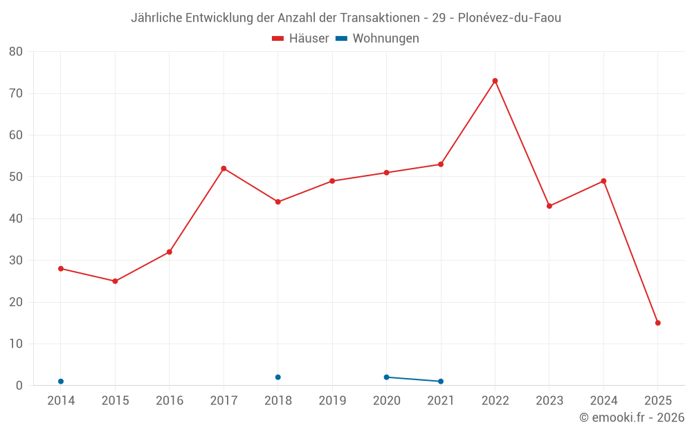 Der Durchschnittspreis auf den 43 Hausgeschäften der letzten 12 Monate in der Gemeinde Plonévez-du-Faou betrug 1 179 € pro Quadratmeter für einen mittleren Immobilienwert von 105 000 €. Über diesen Zeitraum hinweg lagen 60% der Transaktionen zwischen 773 und 1 578 € pro Quadratmeter (vom 2. bis zum 8. Dezil).