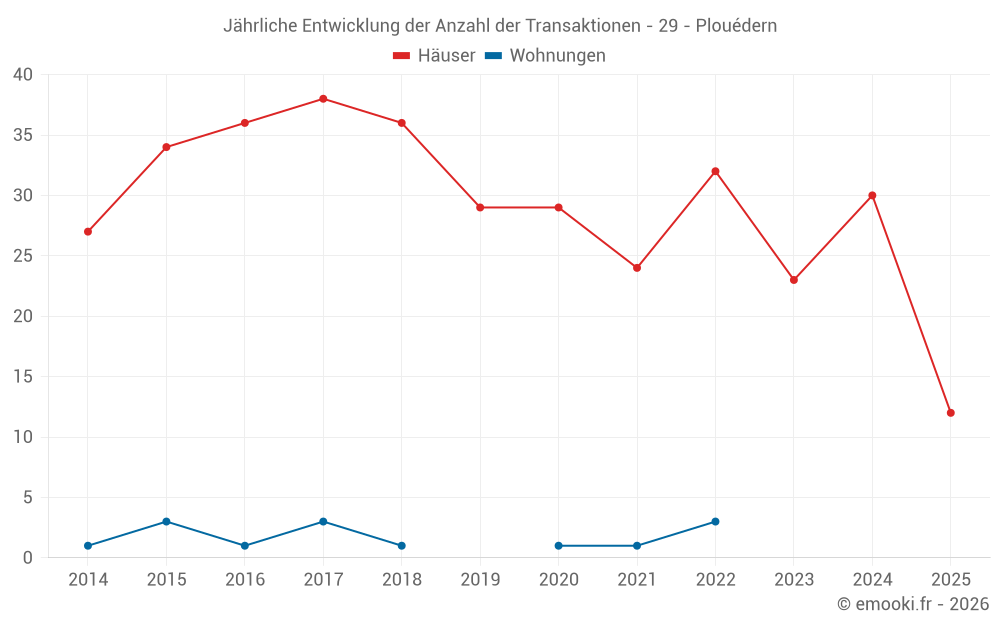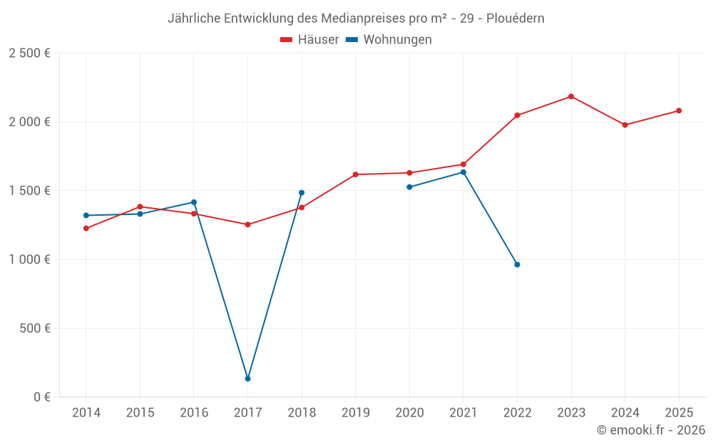 Der Durchschnittspreis auf den 32 Hausgeschäften der letzten 12 Monate in der Gemeinde Plouédern betrug 1 978 € pro Quadratmeter für einen mittleren Immobilienwert von 230 250 €. Über diesen Zeitraum hinweg lagen 60% der Transaktionen zwischen 1 586 und 2 495 € pro Quadratmeter (vom 2. bis zum 8. Dezil).