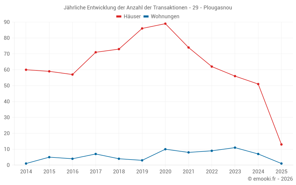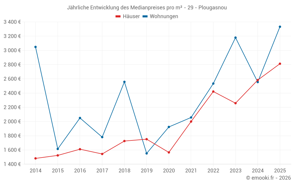 Der Durchschnittspreis auf den 45 Hausgeschäften der letzten 12 Monate in der Gemeinde Plougasnou betrug 2 849 € pro Quadratmeter für einen mittleren Immobilienwert von 247 000 €. Über diesen Zeitraum hinweg lagen 60% der Transaktionen zwischen 1 502 und 3 782 € pro Quadratmeter (vom 2. bis zum 8. Dezil).