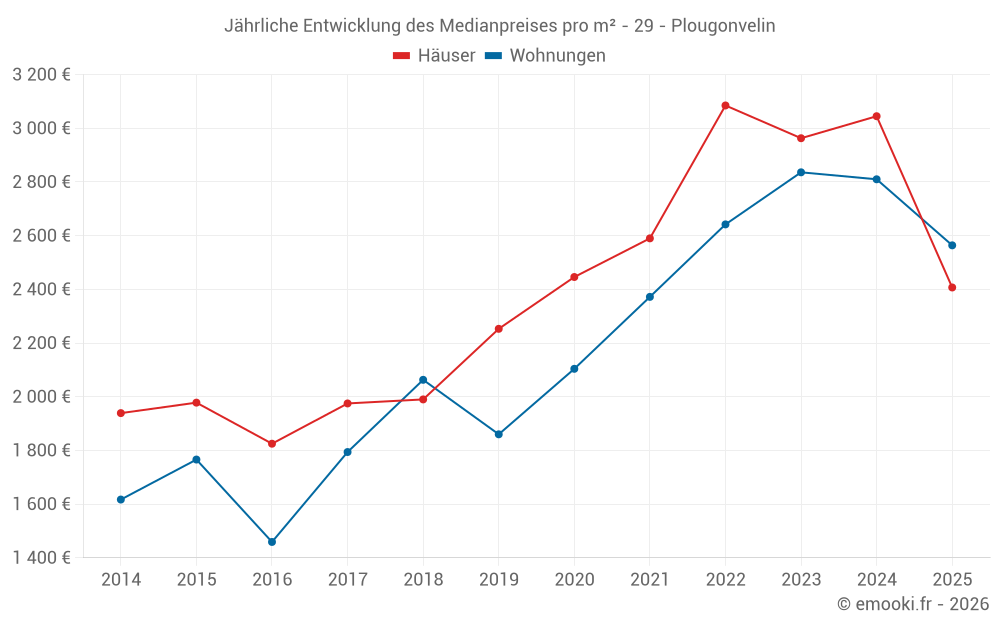 Der Durchschnittspreis auf den 25 Wohnungstransaktionen der letzten 12 Monate in der Gemeinde Plougonvelin betrug 2 593 € pro Quadratmeter für einen mittleren Immobilienwert von 134 000 €. Über diesen Zeitraum hinweg lagen 60% der Transaktionen zwischen 2 052 und 3 201 € pro Quadratmeter (vom 2. bis zum 8. Dezil).