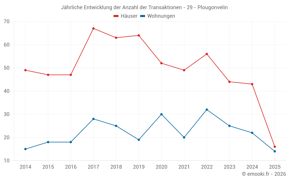 Der Durchschnittspreis auf den 32 Hausgeschäften der letzten 12 Monate in der Gemeinde Plougonvelin betrug 2 882 € pro Quadratmeter für einen mittleren Immobilienwert von 285 000 €. Über diesen Zeitraum hinweg lagen 60% der Transaktionen zwischen 2 232 und 3 900 € pro Quadratmeter (vom 2. bis zum 8. Dezil).
