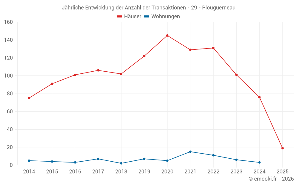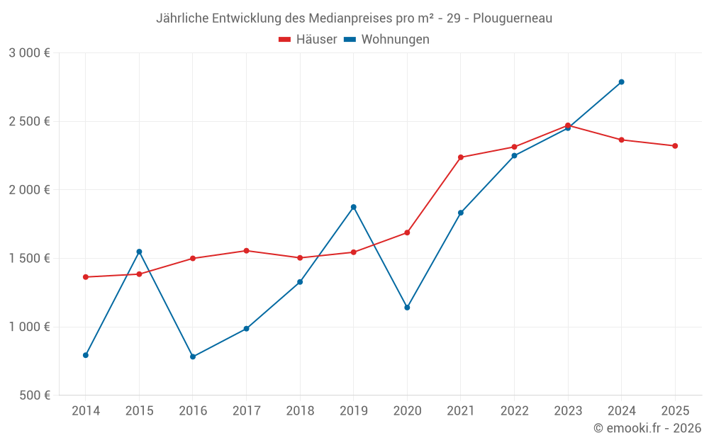 Der Durchschnittspreis auf den 19 Hausgeschäften der letzten 6 Monate in der Gemeinde Plouguerneau betrug 2 321 € pro Quadratmeter für einen mittleren Immobilienwert von 190 000 €. Über diesen Zeitraum hinweg lagen 60% der Transaktionen zwischen 1 683 und 3 380 € pro Quadratmeter (vom 2. bis zum 8. Dezil).
