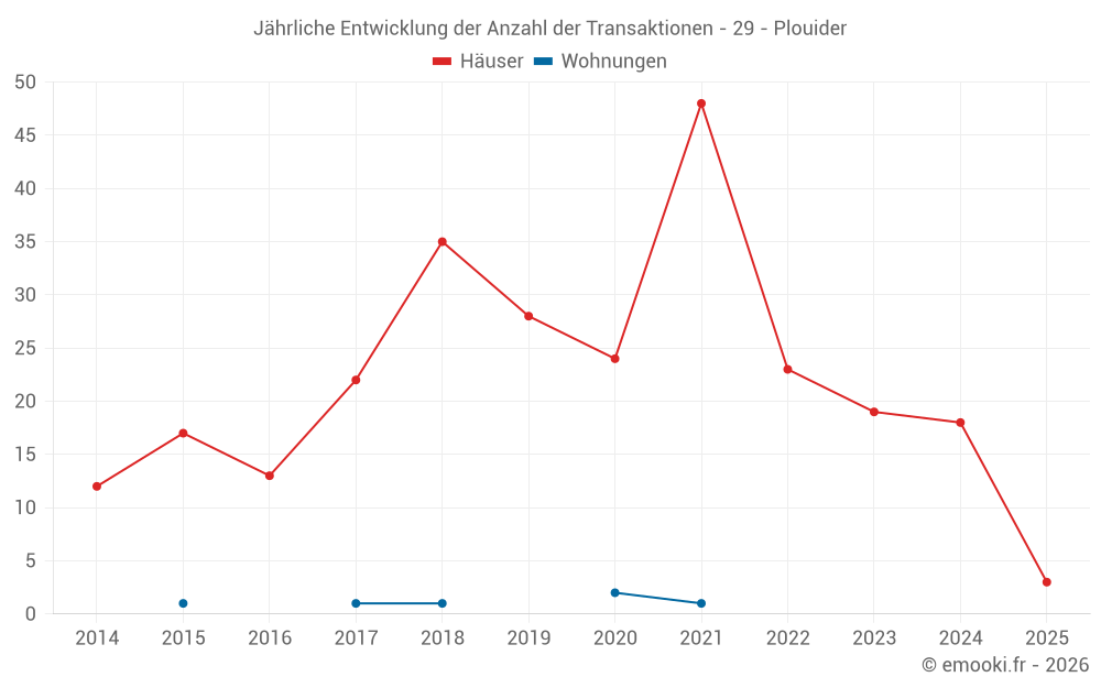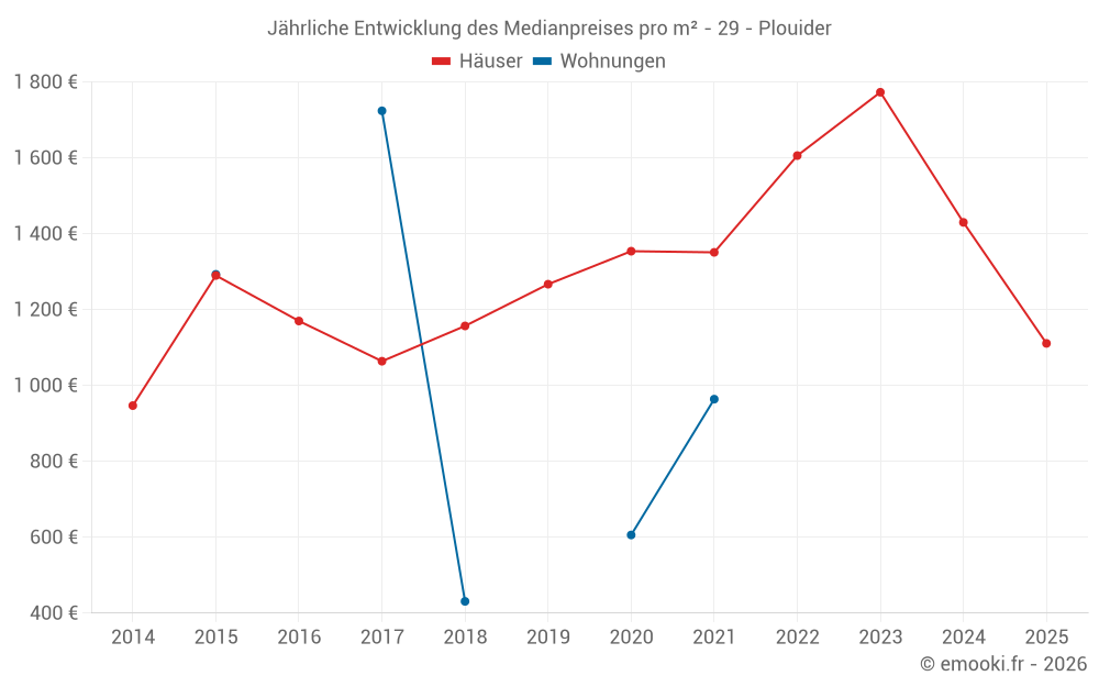 Der Durchschnittspreis auf den 30 Hausgeschäften der letzten 24 Monate in der Gemeinde Plouider betrug 1 434 € pro Quadratmeter für einen mittleren Immobilienwert von 155 000 €. Über diesen Zeitraum hinweg lagen 60% der Transaktionen zwischen 1 110 und 2 029 € pro Quadratmeter (vom 2. bis zum 8. Dezil).