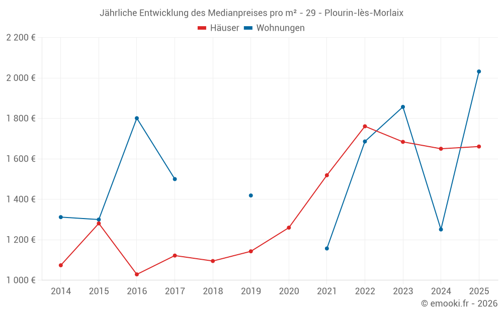 Der Durchschnittspreis auf den 31 Hausgeschäften der letzten 12 Monate in der Gemeinde Plourin-lès-Morlaix betrug 1 752 € pro Quadratmeter für einen mittleren Immobilienwert von 165 000 €. Über diesen Zeitraum hinweg lagen 60% der Transaktionen zwischen 1 237 und 2 102 € pro Quadratmeter (vom 2. bis zum 8. Dezil).