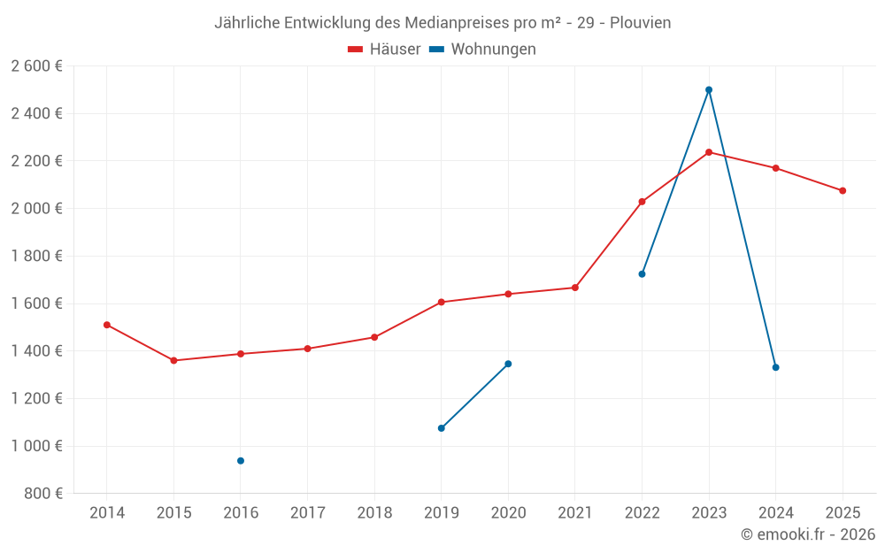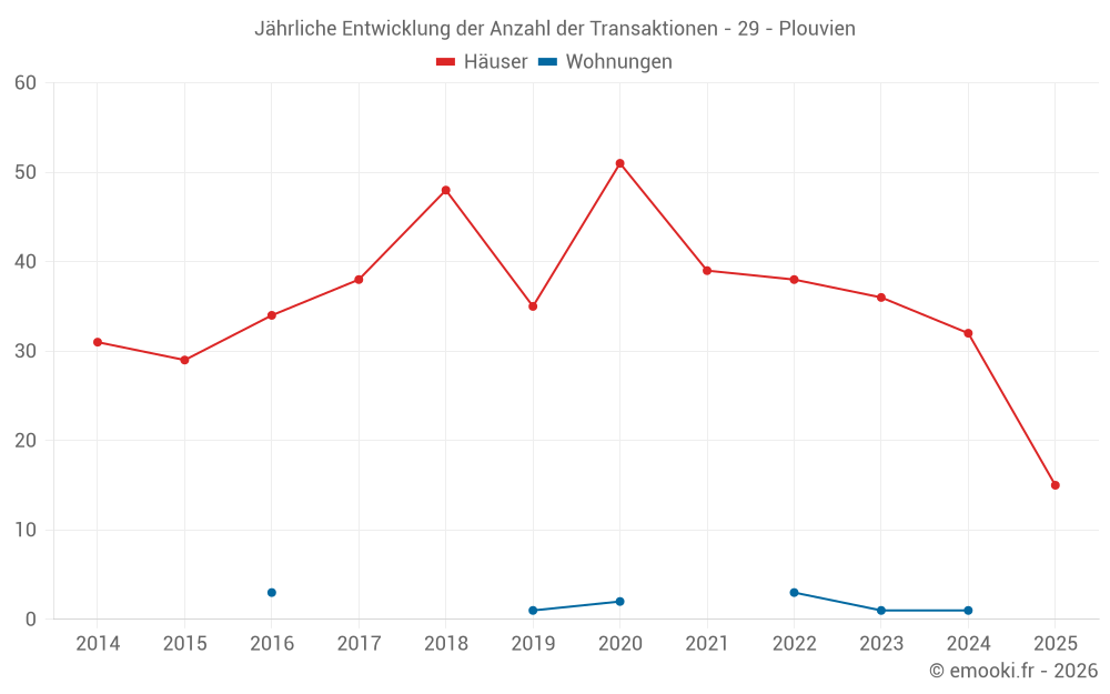 Der Durchschnittspreis auf den 41 Hausgeschäften der letzten 12 Monate in der Gemeinde Plouvien betrug 2 143 € pro Quadratmeter für einen mittleren Immobilienwert von 200 000 €. Über diesen Zeitraum hinweg lagen 60% der Transaktionen zwischen 1 518 und 2 564 € pro Quadratmeter (vom 2. bis zum 8. Dezil).