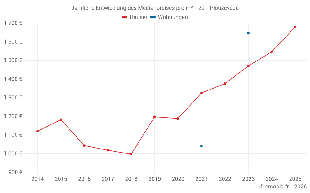 Der Durchschnittspreis auf den 26 Hausgeschäften der letzten 12 Monate in der Gemeinde Plouzévédé betrug 1 625 € pro Quadratmeter für einen mittleren Immobilienwert von 149 000 €. Über diesen Zeitraum hinweg lagen 60% der Transaktionen zwischen 1 119 und 1 989 € pro Quadratmeter (vom 2. bis zum 8. Dezil).