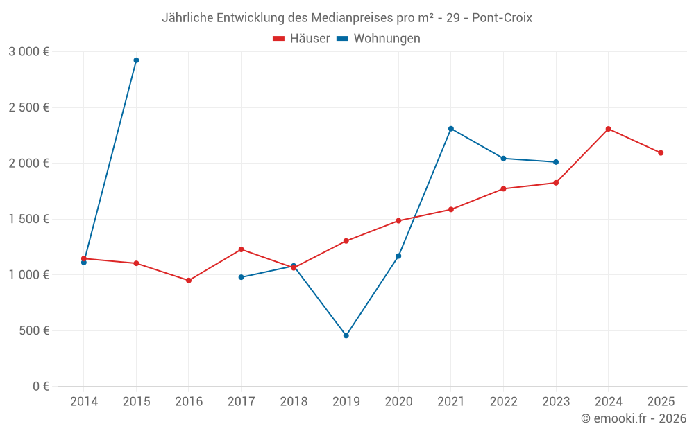 Der Durchschnittspreis auf den 22 Hausgeschäften der letzten 12 Monate in der Gemeinde Pont-Croix betrug 2 191 € pro Quadratmeter für einen mittleren Immobilienwert von 185 750 €. Über diesen Zeitraum hinweg lagen 60% der Transaktionen zwischen 1 869 und 2 544 € pro Quadratmeter (vom 2. bis zum 8. Dezil).