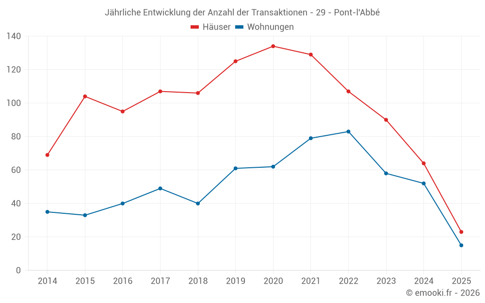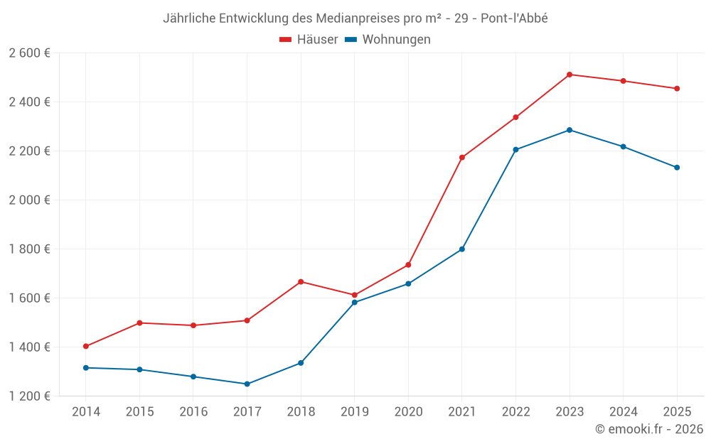 Der Durchschnittspreis auf den 23 Hausgeschäften der letzten 6 Monate in der Gemeinde Pont-l'Abbé betrug 2 455 € pro Quadratmeter für einen mittleren Immobilienwert von 210 000 €. Über diesen Zeitraum hinweg lagen 60% der Transaktionen zwischen 1 953 und 2 906 € pro Quadratmeter (vom 2. bis zum 8. Dezil).