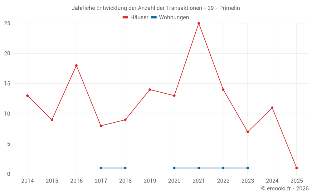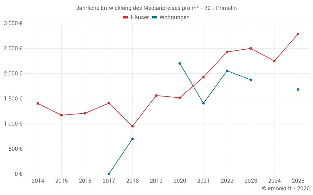 Der Durchschnittspreis auf den 15 Hausgeschäften der letzten 24 Monate in der Gemeinde Primelin betrug 2 275 € pro Quadratmeter für einen mittleren Immobilienwert von 182 000 €. Über diesen Zeitraum hinweg lagen 60% der Transaktionen zwischen 1 251 und 2 570 € pro Quadratmeter (vom 2. bis zum 8. Dezil).
