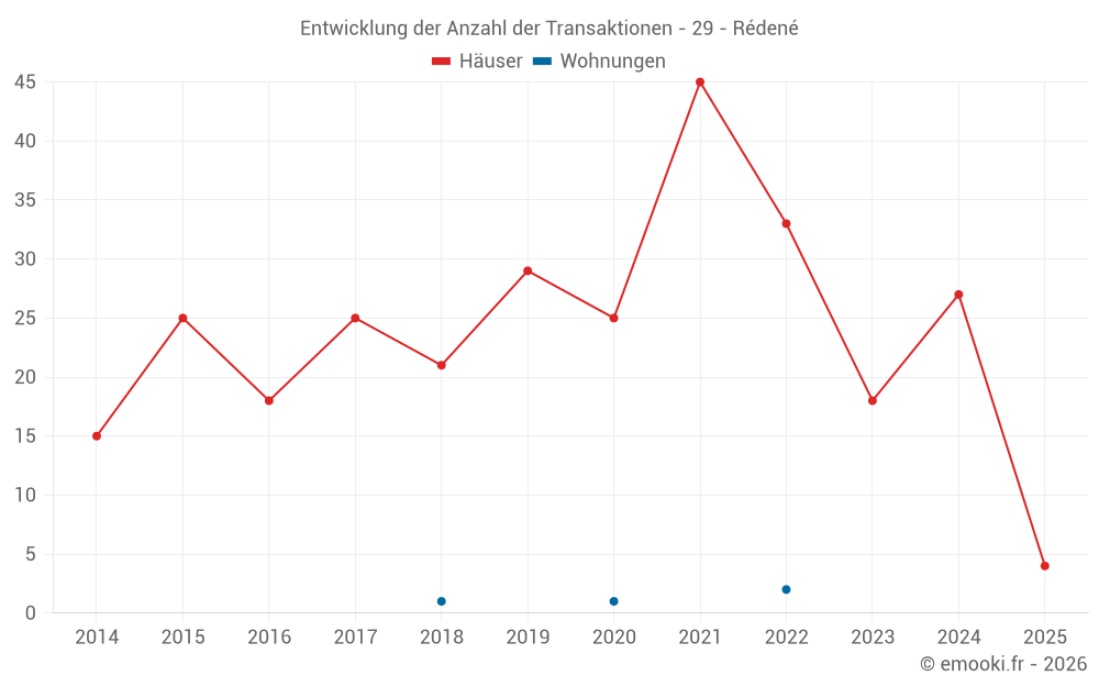 Der Durchschnittspreis auf den 18 Hausgeschäften der letzten 12 Monate in der Gemeinde Rédené betrug 2 412 € pro Quadratmeter für einen mittleren Immobilienwert von 298 505 €. Über diesen Zeitraum hinweg lagen 60% der Transaktionen zwischen 1 731 und 3 150 € pro Quadratmeter (vom 2. bis zum 8. Dezil).