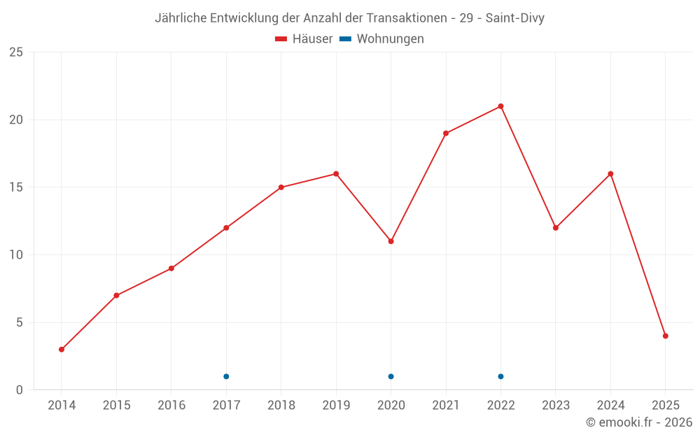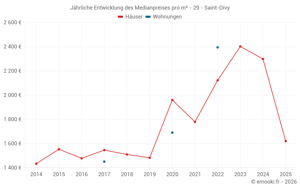 Der Durchschnittspreis auf den 27 Hausgeschäften der letzten 24 Monate in der Gemeinde Saint-Divy betrug 2 296 € pro Quadratmeter für einen mittleren Immobilienwert von 232 000 €. Über diesen Zeitraum hinweg lagen 60% der Transaktionen zwischen 1 618 und 2 823 € pro Quadratmeter (vom 2. bis zum 8. Dezil).