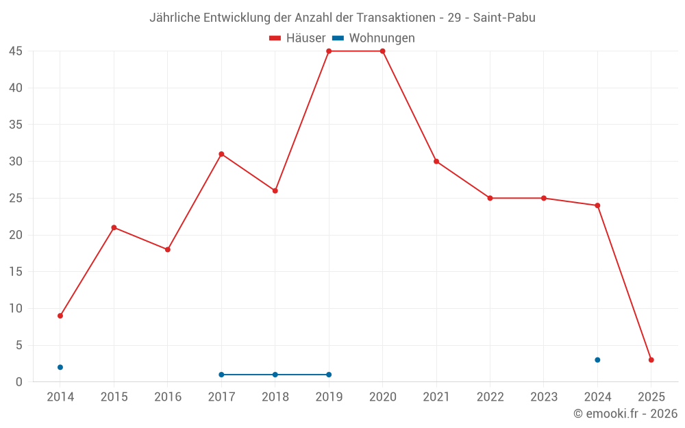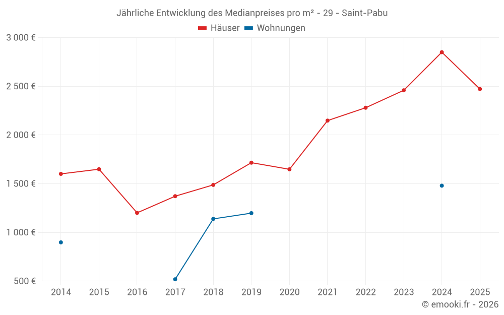 Der Durchschnittspreis auf den 18 Hausgeschäften der letzten 12 Monate in der Gemeinde Saint-Pabu betrug 2 742 € pro Quadratmeter für einen mittleren Immobilienwert von 280 245 €. Über diesen Zeitraum hinweg lagen 60% der Transaktionen zwischen 1 997 und 3 318 € pro Quadratmeter (vom 2. bis zum 8. Dezil).