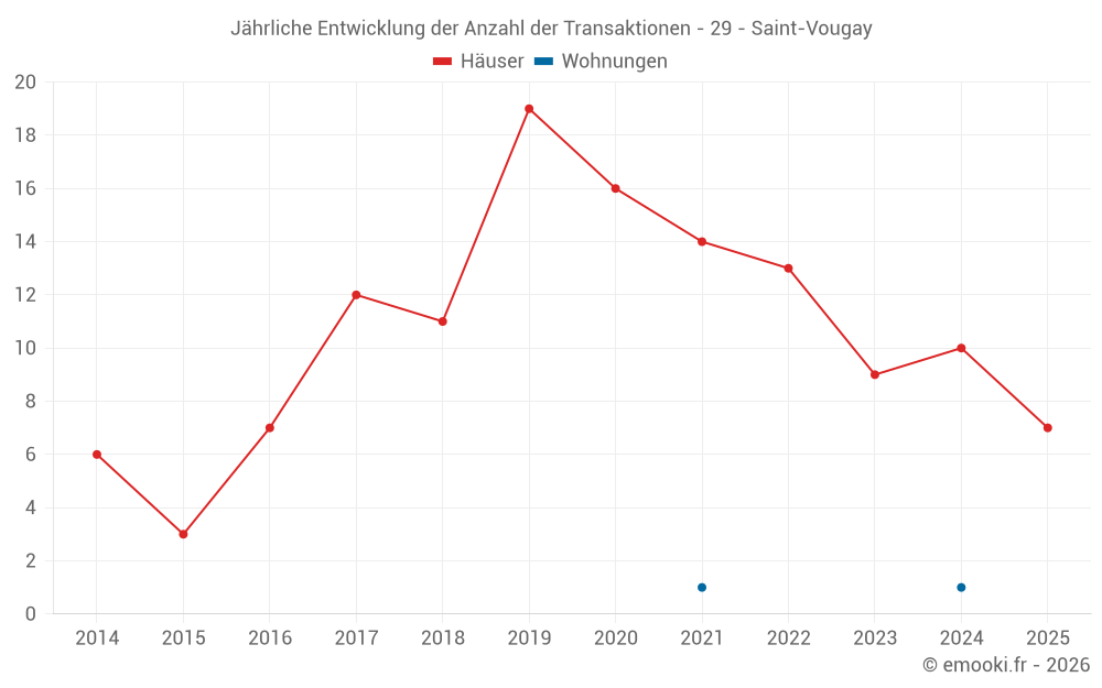 Der Durchschnittspreis auf den 21 Hausgeschäften der letzten 24 Monate in der Gemeinde Saint-Vougay betrug 1 609 € pro Quadratmeter für einen mittleren Immobilienwert von 165 000 €. Über diesen Zeitraum hinweg lagen 60% der Transaktionen zwischen 1 227 und 2 098 € pro Quadratmeter (vom 2. bis zum 8. Dezil).