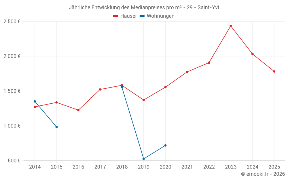 Der Durchschnittspreis auf den 20 Hausgeschäften der letzten 12 Monate in der Gemeinde Saint-Yvi betrug 1 888 € pro Quadratmeter für einen mittleren Immobilienwert von 205 750 €. Über diesen Zeitraum hinweg lagen 60% der Transaktionen zwischen 1 562 und 2 540 € pro Quadratmeter (vom 2. bis zum 8. Dezil).