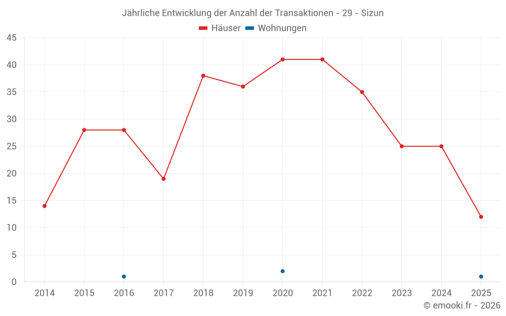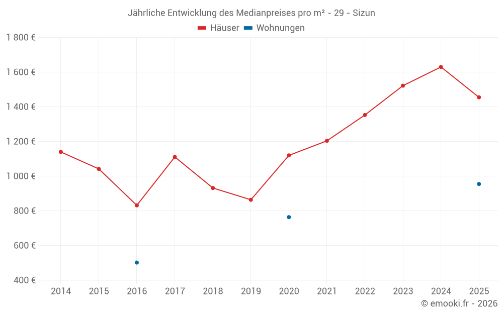 Der Durchschnittspreis auf den 22 Hausgeschäften der letzten 12 Monate in der Gemeinde Sizun betrug 1 568 € pro Quadratmeter für einen mittleren Immobilienwert von 162 200 €. Über diesen Zeitraum hinweg lagen 60% der Transaktionen zwischen 1 183 und 2 110 € pro Quadratmeter (vom 2. bis zum 8. Dezil).