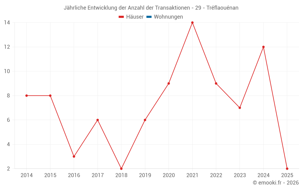 Der Durchschnittspreis auf den 15 Hausgeschäften der letzten 24 Monate in der Gemeinde Tréflaouénan betrug 1 190 € pro Quadratmeter für einen mittleren Immobilienwert von 150 000 €. Über diesen Zeitraum hinweg lagen 60% der Transaktionen zwischen 726 und 2 067 € pro Quadratmeter (vom 2. bis zum 8. Dezil).