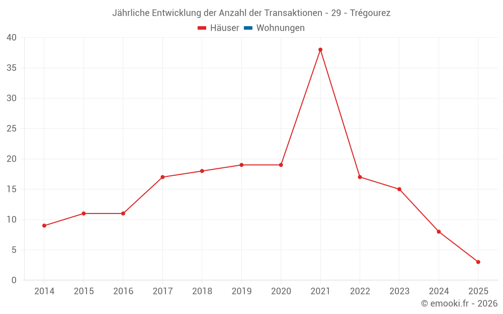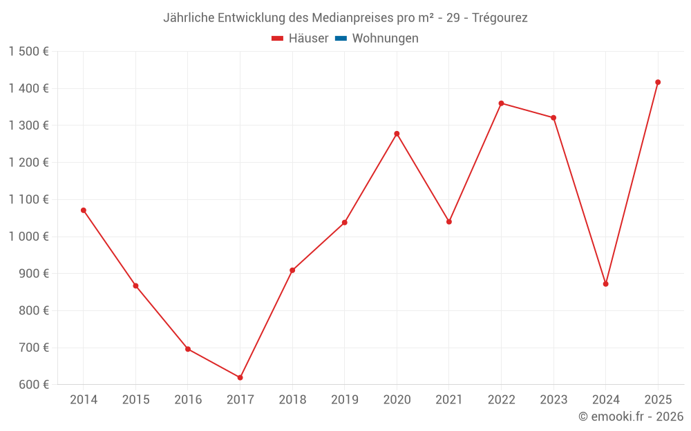 Der Durchschnittspreis auf den 16 Hausgeschäften der letzten 24 Monate in der Gemeinde Trégourez betrug 1 144 € pro Quadratmeter für einen mittleren Immobilienwert von 72 674 €. Über diesen Zeitraum hinweg lagen 60% der Transaktionen zwischen 618 und 1 368 € pro Quadratmeter (vom 2. bis zum 8. Dezil).