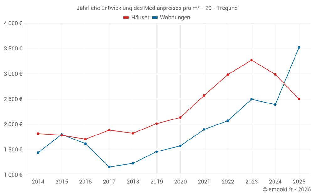 Der Durchschnittspreis auf den 18 Wohnungstransaktionen der letzten 24 Monate in der Gemeinde Trégunc betrug 2 520 € pro Quadratmeter für einen mittleren Immobilienwert von 145 500 €. Über diesen Zeitraum hinweg lagen 60% der Transaktionen zwischen 1 944 und 3 677 € pro Quadratmeter (vom 2. bis zum 8. Dezil).
