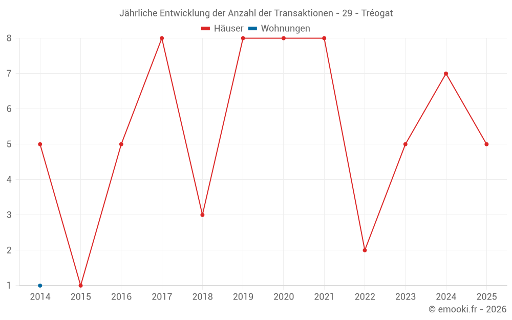 Der Durchschnittspreis auf den 16 Hausgeschäften der letzten 24 Monate in der Gemeinde Tréogat betrug 1 778 € pro Quadratmeter für einen mittleren Immobilienwert von 217 375 €. Über diesen Zeitraum hinweg lagen 60% der Transaktionen zwischen 1 460 und 2 375 € pro Quadratmeter (vom 2. bis zum 8. Dezil).