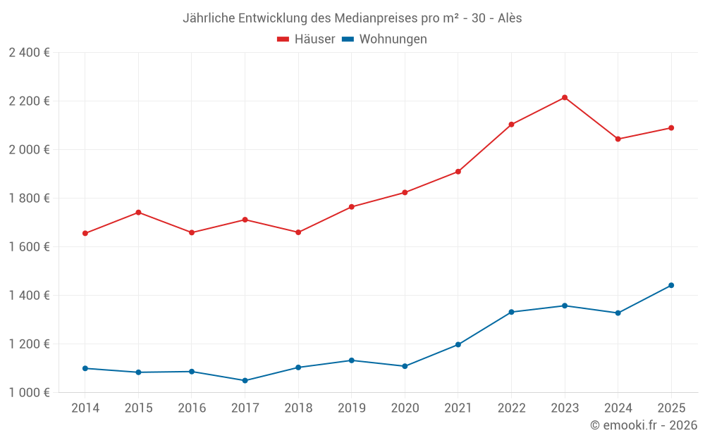 Der Durchschnittspreis auf den 45 Hausgeschäften der letzten 3 Monate in der Gemeinde Alès betrug 2 121 € pro Quadratmeter für einen mittleren Immobilienwert von 180 000 €. Über diesen Zeitraum hinweg lagen 60% der Transaktionen zwischen 1 551 und 2 511 € pro Quadratmeter (vom 2. bis zum 8. Dezil).