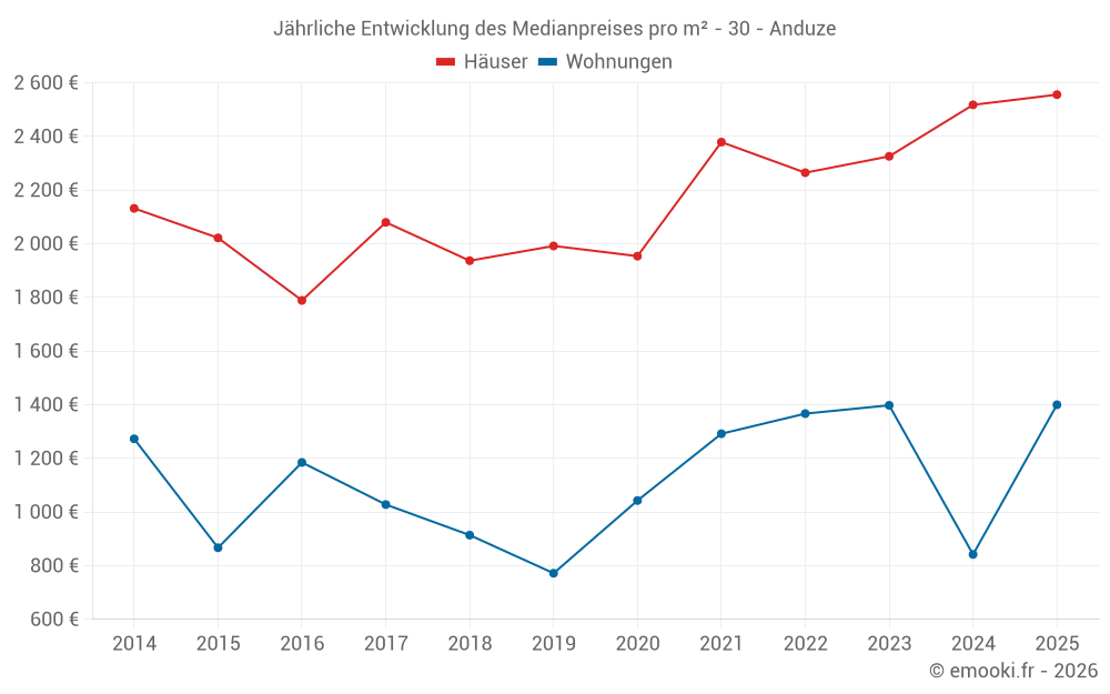 Der Durchschnittspreis auf den 27 Wohnungstransaktionen der letzten 24 Monate in der Gemeinde Anduze betrug 1 203 € pro Quadratmeter für einen mittleren Immobilienwert von 85 000 €. Über diesen Zeitraum hinweg lagen 60% der Transaktionen zwischen 825 und 1 691 € pro Quadratmeter (vom 2. bis zum 8. Dezil).