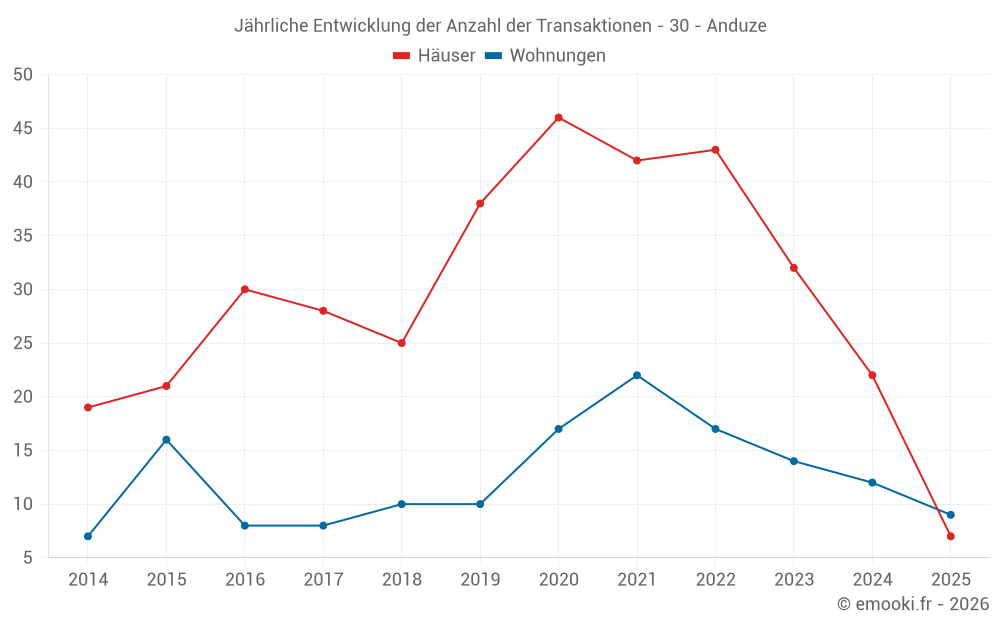 Der Durchschnittspreis auf den 22 Hausgeschäften der letzten 12 Monate in der Gemeinde Anduze betrug 2 613 € pro Quadratmeter für einen mittleren Immobilienwert von 218 000 €. Über diesen Zeitraum hinweg lagen 60% der Transaktionen zwischen 1 379 und 3 177 € pro Quadratmeter (vom 2. bis zum 8. Dezil).