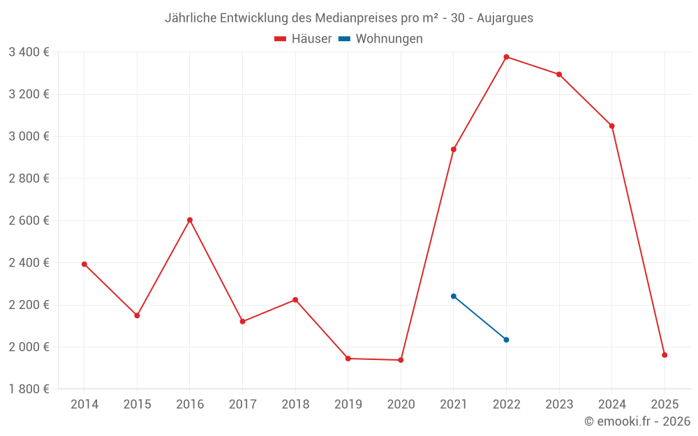 Der Durchschnittspreis auf den 18 Hausgeschäften der letzten 24 Monate in der Gemeinde Aujargues betrug 3 222 € pro Quadratmeter für einen mittleren Immobilienwert von 306 000 €. Über diesen Zeitraum hinweg lagen 60% der Transaktionen zwischen 2 261 und 3 868 € pro Quadratmeter (vom 2. bis zum 8. Dezil).