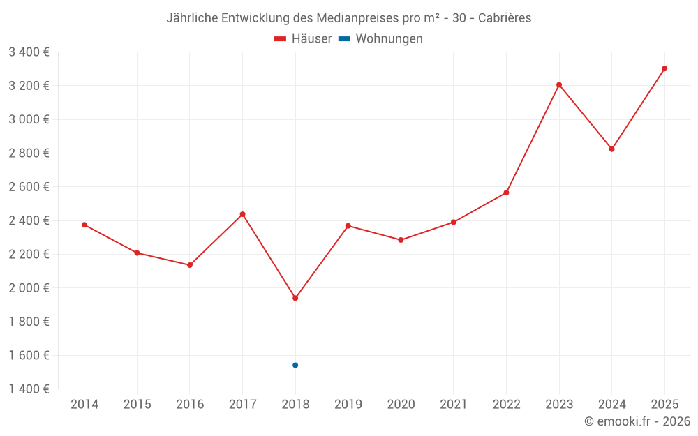 Der Durchschnittspreis auf den 16 Hausgeschäften der letzten 12 Monate in der Gemeinde Cabrières betrug 3 196 € pro Quadratmeter für einen mittleren Immobilienwert von 261 225 €. Über diesen Zeitraum hinweg lagen 60% der Transaktionen zwischen 2 722 und 3 388 € pro Quadratmeter (vom 2. bis zum 8. Dezil).