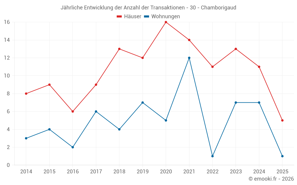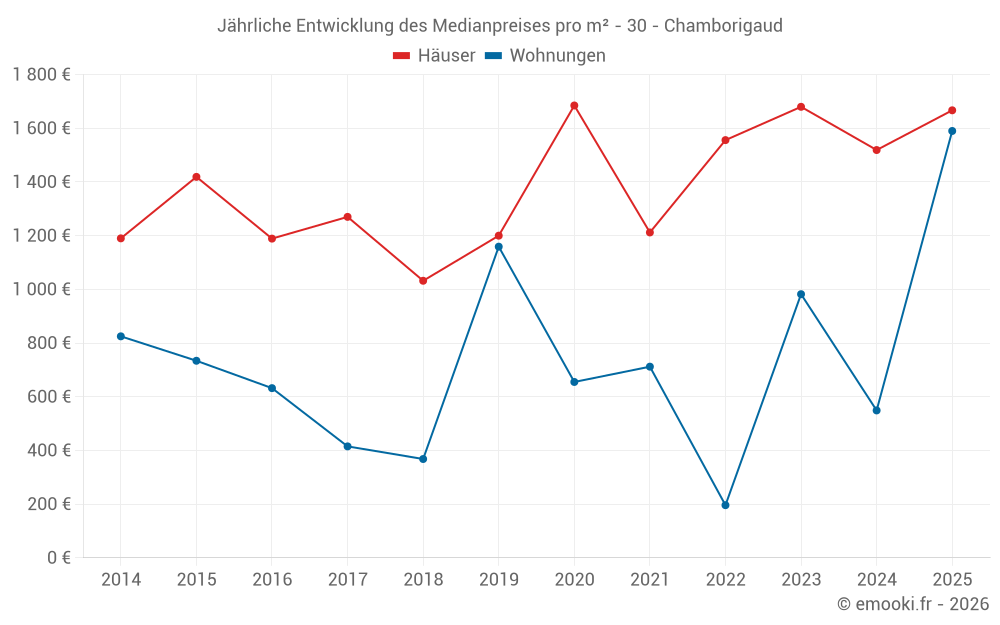 Der Durchschnittspreis auf den 23 Hausgeschäften der letzten 24 Monate in der Gemeinde Chamborigaud betrug 1 615 € pro Quadratmeter für einen mittleren Immobilienwert von 98 760 €. Über diesen Zeitraum hinweg lagen 60% der Transaktionen zwischen 1 274 und 1 890 € pro Quadratmeter (vom 2. bis zum 8. Dezil).