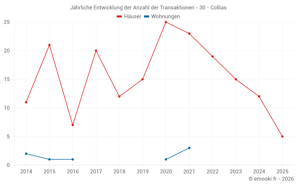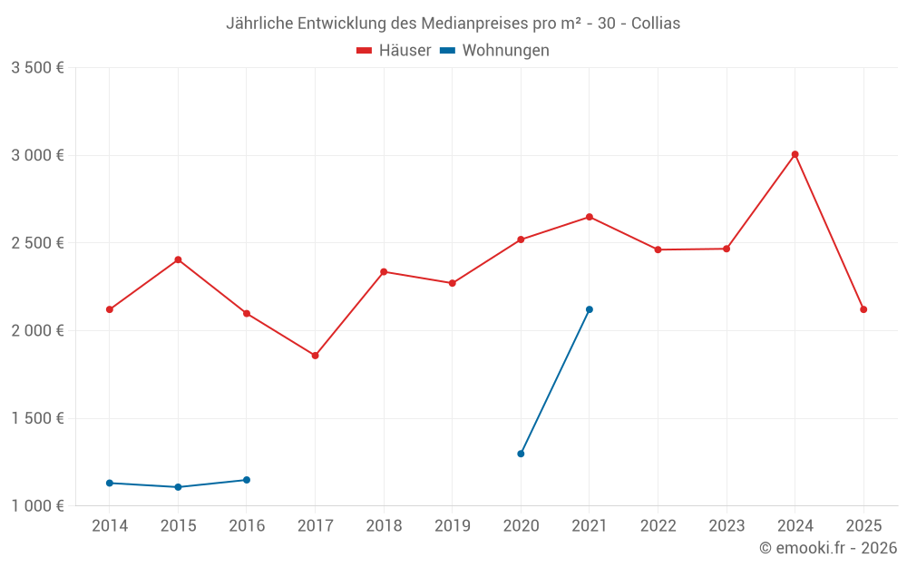 Der Durchschnittspreis auf den 24 Hausgeschäften der letzten 24 Monate in der Gemeinde Collias betrug 2 574 € pro Quadratmeter für einen mittleren Immobilienwert von 190 000 €. Über diesen Zeitraum hinweg lagen 60% der Transaktionen zwischen 1 735 und 3 225 € pro Quadratmeter (vom 2. bis zum 8. Dezil).