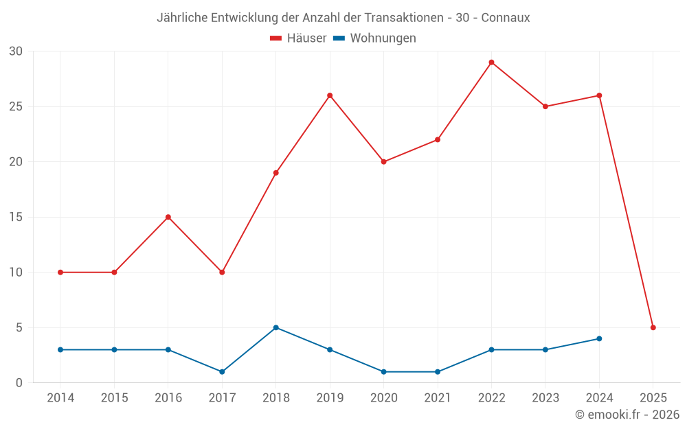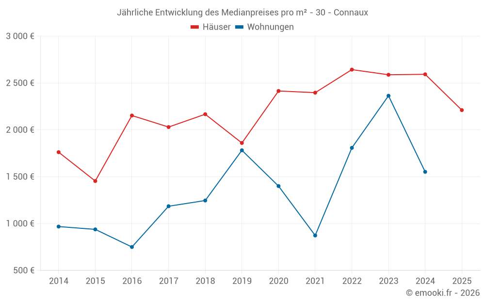 Der Durchschnittspreis auf den 19 Hausgeschäften der letzten 12 Monate in der Gemeinde Connaux betrug 2 592 € pro Quadratmeter für einen mittleren Immobilienwert von 205 000 €. Über diesen Zeitraum hinweg lagen 60% der Transaktionen zwischen 1 676 und 3 276 € pro Quadratmeter (vom 2. bis zum 8. Dezil).