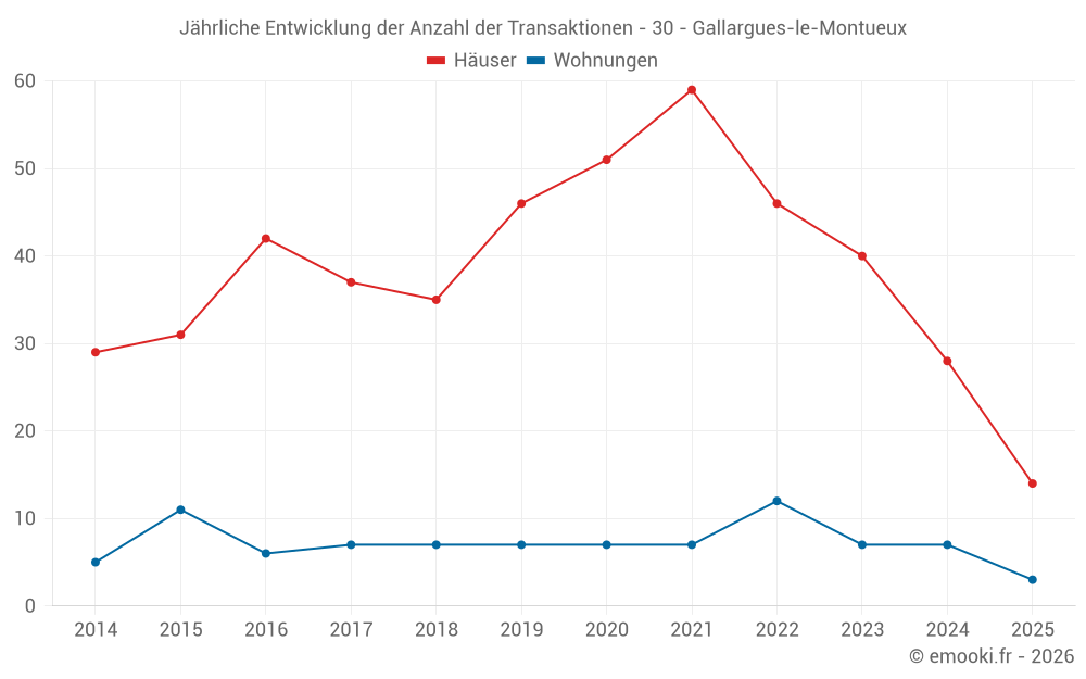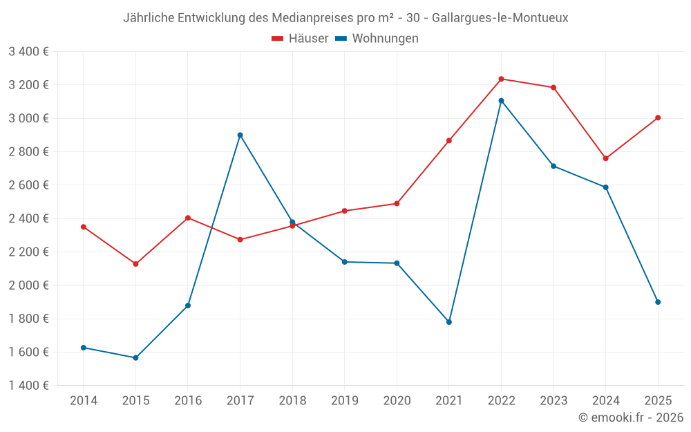 Der Durchschnittspreis auf den 34 Hausgeschäften der letzten 12 Monate in der Gemeinde Gallargues-le-Montueux betrug 2 870 € pro Quadratmeter für einen mittleren Immobilienwert von 248 050 €. Über diesen Zeitraum hinweg lagen 60% der Transaktionen zwischen 2 125 und 3 414 € pro Quadratmeter (vom 2. bis zum 8. Dezil).