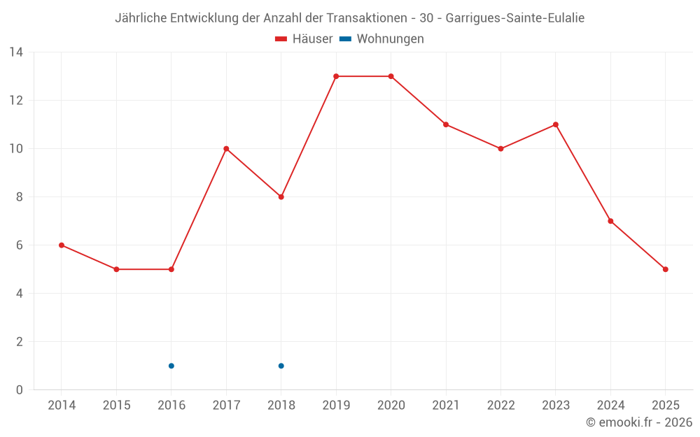 Der Durchschnittspreis auf den 17 Hausgeschäften der letzten 24 Monate in der Gemeinde Garrigues-Sainte-Eulalie betrug 3 438 € pro Quadratmeter für einen mittleren Immobilienwert von 385 770 €. Über diesen Zeitraum hinweg lagen 60% der Transaktionen zwischen 3 018 und 3 918 € pro Quadratmeter (vom 2. bis zum 8. Dezil).