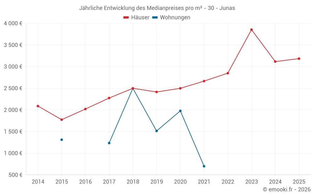 Der Durchschnittspreis auf den 25 Hausgeschäften der letzten 24 Monate in der Gemeinde Junas betrug 3 149 € pro Quadratmeter für einen mittleren Immobilienwert von 306 200 €. Über diesen Zeitraum hinweg lagen 60% der Transaktionen zwischen 2 529 und 3 853 € pro Quadratmeter (vom 2. bis zum 8. Dezil).