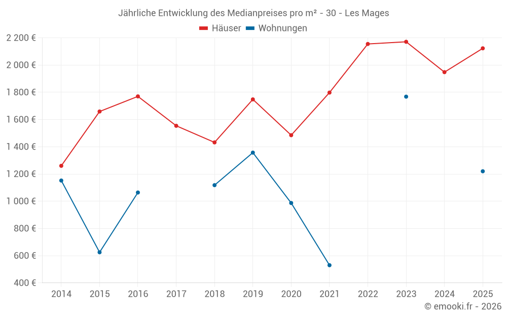 Der Durchschnittspreis auf den 17 Hausgeschäften der letzten 12 Monate in der Gemeinde Les Mages betrug 1 956 € pro Quadratmeter für einen mittleren Immobilienwert von 184 000 €. Über diesen Zeitraum hinweg lagen 60% der Transaktionen zwischen 1 116 und 2 600 € pro Quadratmeter (vom 2. bis zum 8. Dezil).