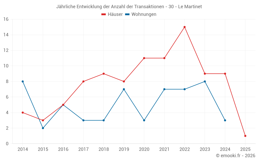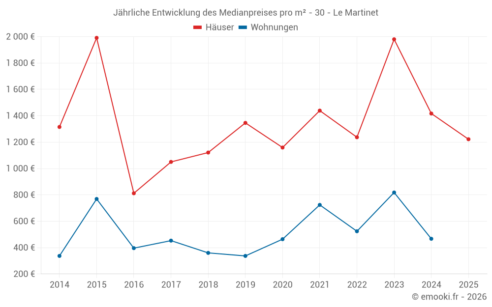 Der Durchschnittspreis auf den 14 Hausgeschäften der letzten 24 Monate in der Gemeinde Le Martinet betrug 1 490 € pro Quadratmeter für einen mittleren Immobilienwert von 137 500 €. Über diesen Zeitraum hinweg lagen 60% der Transaktionen zwischen 973 und 2 228 € pro Quadratmeter (vom 2. bis zum 8. Dezil).