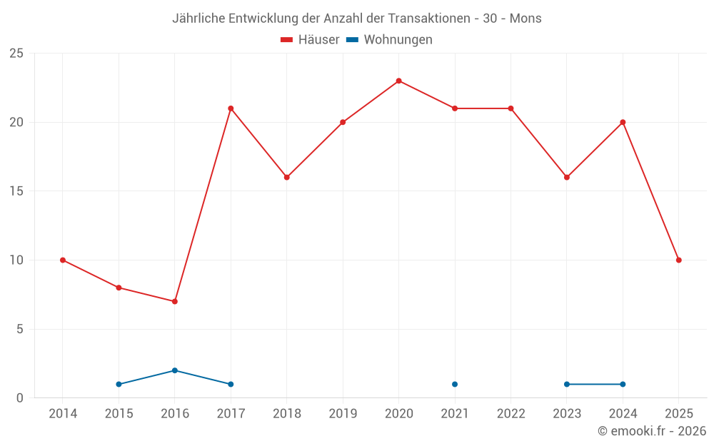 Der Durchschnittspreis auf den 21 Hausgeschäften der letzten 12 Monate in der Gemeinde Mons betrug 2 112 € pro Quadratmeter für einen mittleren Immobilienwert von 231 050 €. Über diesen Zeitraum hinweg lagen 60% der Transaktionen zwischen 1 762 und 2 530 € pro Quadratmeter (vom 2. bis zum 8. Dezil).