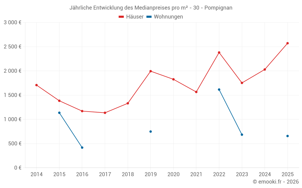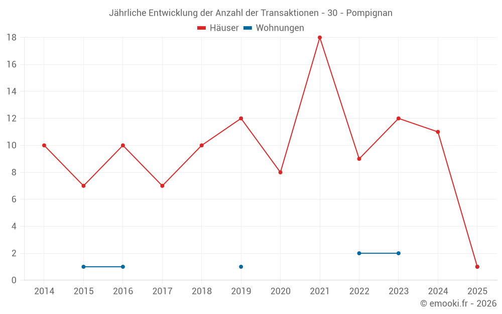 Der Durchschnittspreis auf den 18 Hausgeschäften der letzten 24 Monate in der Gemeinde Pompignan betrug 2 170 € pro Quadratmeter für einen mittleren Immobilienwert von 212 750 €. Über diesen Zeitraum hinweg lagen 60% der Transaktionen zwischen 1 242 und 3 086 € pro Quadratmeter (vom 2. bis zum 8. Dezil).