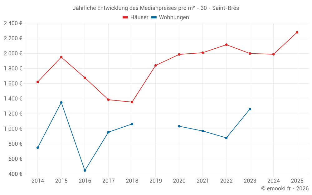 Der Durchschnittspreis auf den 22 Hausgeschäften der letzten 24 Monate in der Gemeinde Saint-Brès betrug 1 988 € pro Quadratmeter für einen mittleren Immobilienwert von 183 000 €. Über diesen Zeitraum hinweg lagen 60% der Transaktionen zwischen 1 752 und 2 575 € pro Quadratmeter (vom 2. bis zum 8. Dezil).