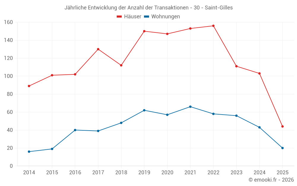 Der Durchschnittspreis auf den 44 Hausgeschäften der letzten 6 Monate in der Gemeinde Saint-Gilles betrug 2 444 € pro Quadratmeter für einen mittleren Immobilienwert von 215 000 €. Über diesen Zeitraum hinweg lagen 60% der Transaktionen zwischen 1 812 und 2 898 € pro Quadratmeter (vom 2. bis zum 8. Dezil).