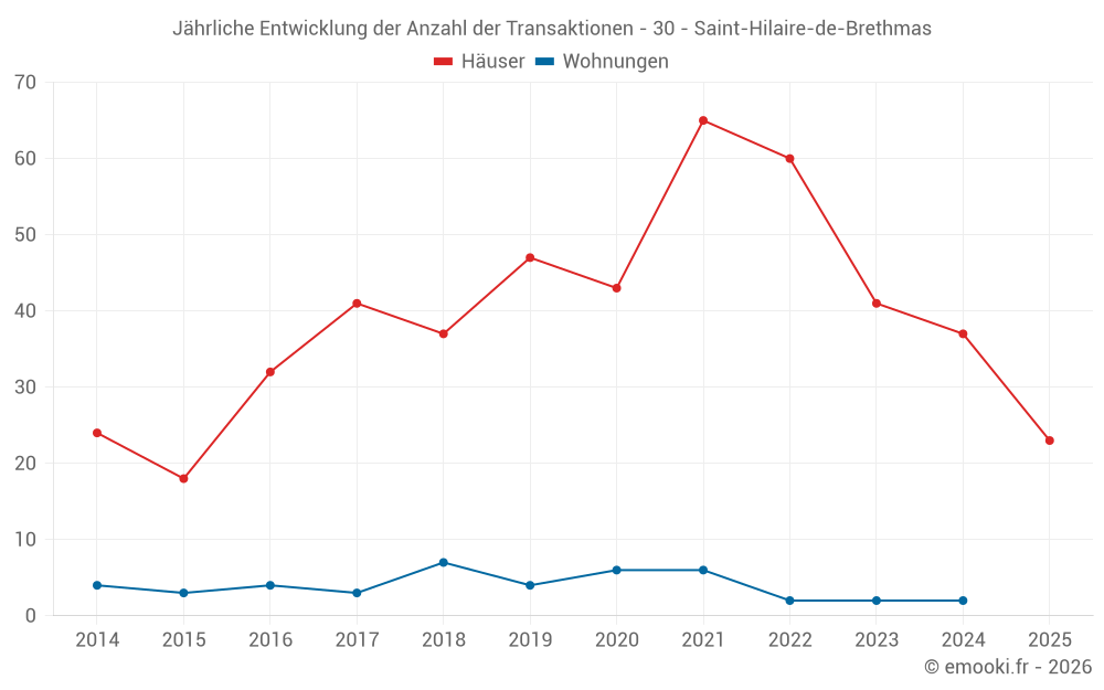 Der Durchschnittspreis auf den 23 Hausgeschäften der letzten 6 Monate in der Gemeinde Saint-Hilaire-de-Brethmas betrug 2 279 € pro Quadratmeter für einen mittleren Immobilienwert von 208 000 €. Über diesen Zeitraum hinweg lagen 60% der Transaktionen zwischen 1 832 und 2 688 € pro Quadratmeter (vom 2. bis zum 8. Dezil).
