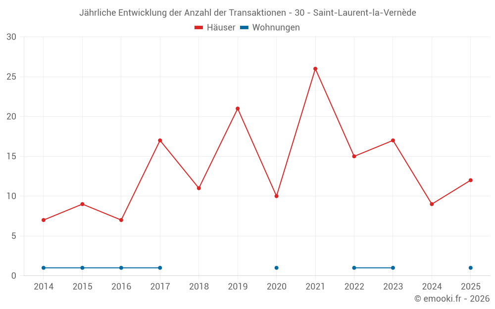Der Durchschnittspreis auf den 21 Hausgeschäften der letzten 24 Monate in der Gemeinde Saint-Laurent-la-Vernède betrug 2 917 € pro Quadratmeter für einen mittleren Immobilienwert von 233 000 €. Über diesen Zeitraum hinweg lagen 60% der Transaktionen zwischen 2 428 und 3 561 € pro Quadratmeter (vom 2. bis zum 8. Dezil).