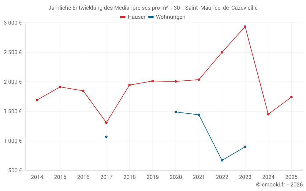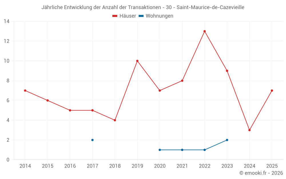 Der Durchschnittspreis auf den 14 Hausgeschäften der letzten 24 Monate in der Gemeinde Saint-Maurice-de-Cazevieille betrug 1 746 € pro Quadratmeter für einen mittleren Immobilienwert von 166 000 €. Über diesen Zeitraum hinweg lagen 60% der Transaktionen zwischen 1 181 und 2 901 € pro Quadratmeter (vom 2. bis zum 8. Dezil).