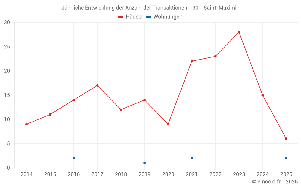 Der Durchschnittspreis auf den 37 Hausgeschäften der letzten 24 Monate in der Gemeinde Saint-Maximin betrug 3 505 € pro Quadratmeter für einen mittleren Immobilienwert von 403 930 €. Über diesen Zeitraum hinweg lagen 60% der Transaktionen zwischen 2 846 und 4 319 € pro Quadratmeter (vom 2. bis zum 8. Dezil).