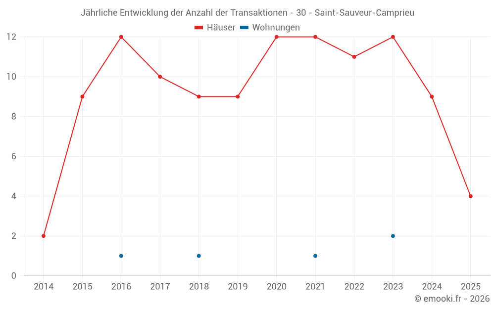 Der Durchschnittspreis auf den 21 Hausgeschäften der letzten 24 Monate in der Gemeinde Saint-Sauveur-Camprieu betrug 2 778 € pro Quadratmeter für einen mittleren Immobilienwert von 190 000 €. Über diesen Zeitraum hinweg lagen 60% der Transaktionen zwischen 1 628 und 4 167 € pro Quadratmeter (vom 2. bis zum 8. Dezil).
