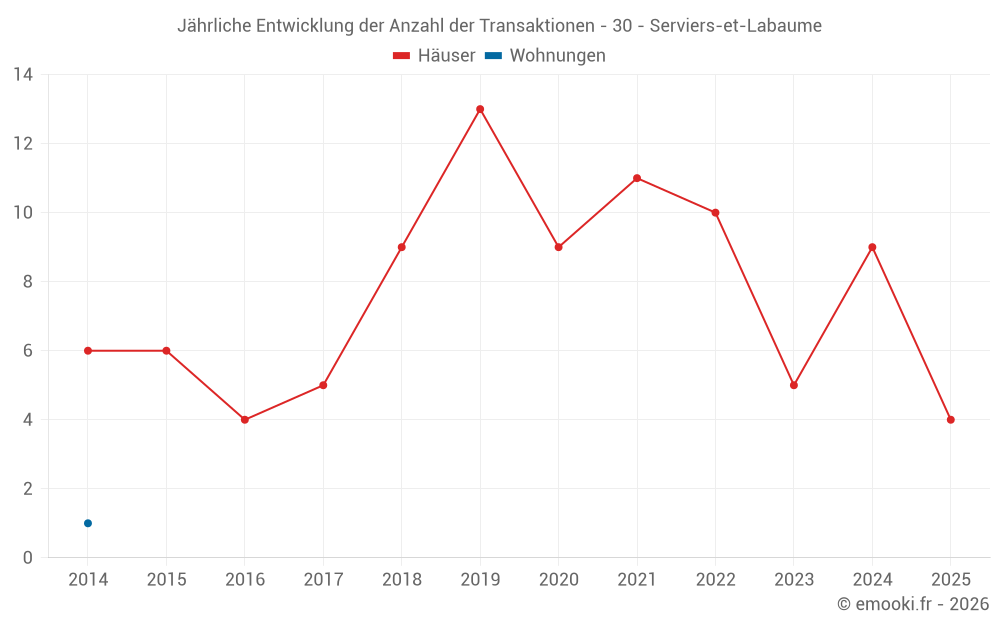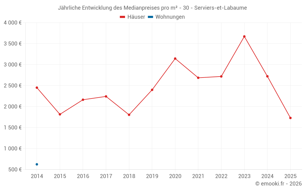 Der Durchschnittspreis auf den 15 Hausgeschäften der letzten 24 Monate in der Gemeinde Serviers-et-Labaume betrug 2 722 € pro Quadratmeter für einen mittleren Immobilienwert von 260 000 €. Über diesen Zeitraum hinweg lagen 60% der Transaktionen zwischen 1 762 und 3 896 € pro Quadratmeter (vom 2. bis zum 8. Dezil).