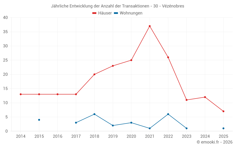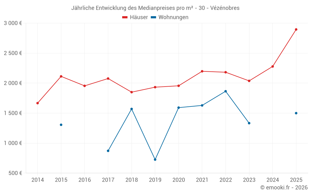 Der Durchschnittspreis auf den 23 Hausgeschäften der letzten 24 Monate in der Gemeinde Vézénobres betrug 2 329 € pro Quadratmeter für einen mittleren Immobilienwert von 250 000 €. Über diesen Zeitraum hinweg lagen 60% der Transaktionen zwischen 1 697 und 3 023 € pro Quadratmeter (vom 2. bis zum 8. Dezil).